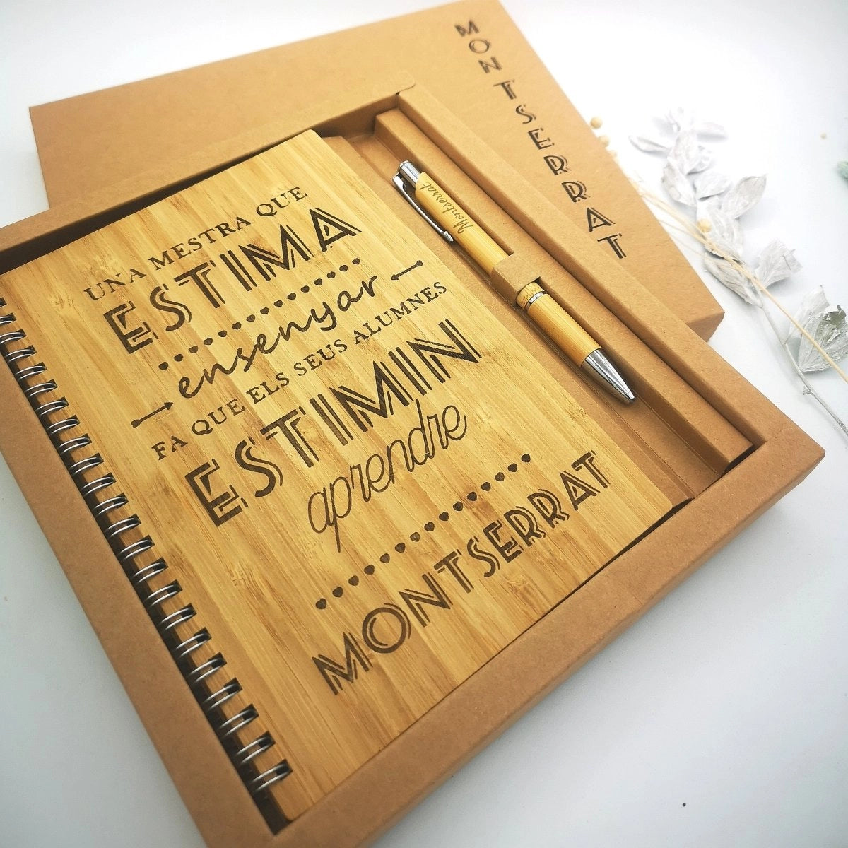 El nostre set de regal compta amb una llibreta de paper reciclat amb tapes de fusta de bambú personalitzades a làser.