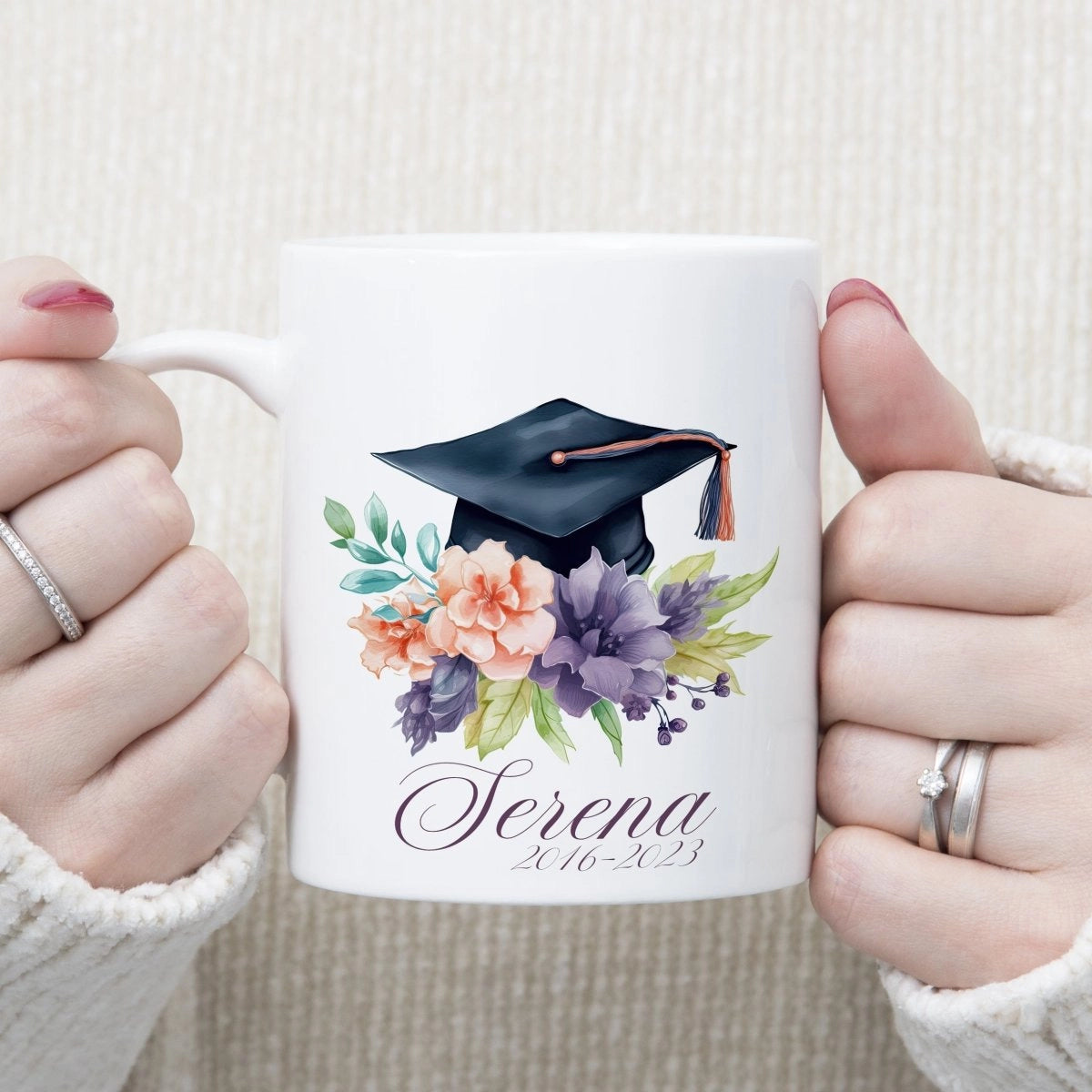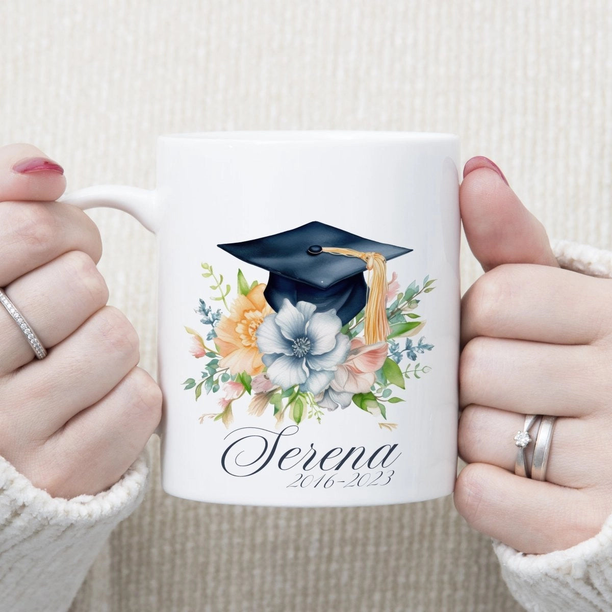 Celebra el teu èxit acadèmic amb la nostra exclusiva tassa de ceràmica personalitzada amb imatge estil aquarel·la i barret de graduació! Aquesta tassa única és perfecta per commemorar el teu èxit i recordar aquests meravellosos anys escolars.