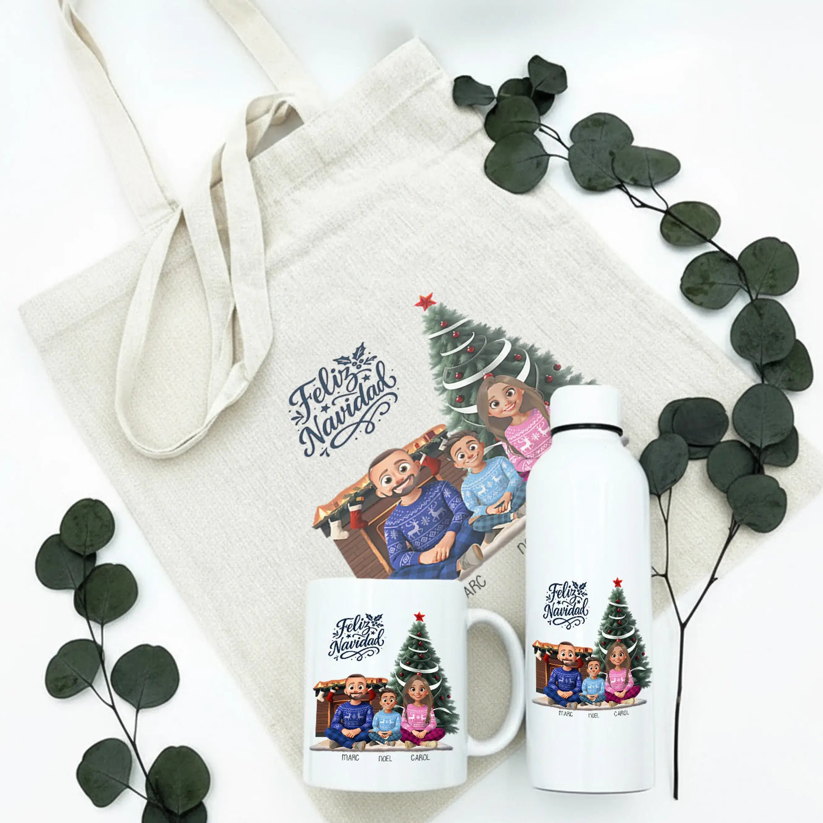Este set incluye tres piezas imprescindibles —tote bag, botella termo y taza cerámica— personalizadas con vuestra ilustración familiar OHANA. Diseña vuestra composición en nuestro editor visual online: elige número de personajes, peinados, ropa, tonos, fondo y añade nombres para crear una escena tierna, moderna y totalmente única. Perfecto para familias con uno, dos o tres hijos, y adaptable si necesitas ampliar la composición.