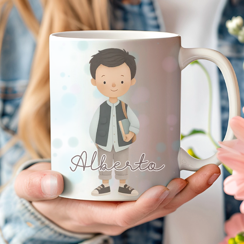 Esta taza permite editar directamente en pantalla para ver cómo quedará el diseño antes de imprimir. Cada personaje puede configurarse para que se parezca a la maestra, maestro o profesor, creando un recuerdo totalmente personal y lleno de significado. También puedes añadir una dedicatoria personalizada o una frase especial de agradecimiento.