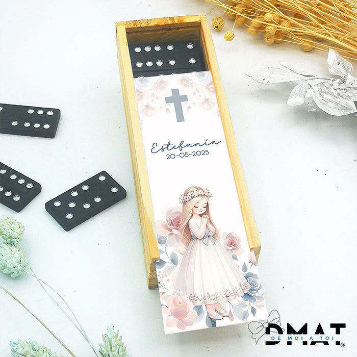 Este regalo personalizado no solo es un juego que dará horas de diversión, sino también un precioso obsequio que quedará en el recuerdo de todos los que asistan a la comunión. Dominó de madera para comunión, un regalo que combina tradición, personalización y mucho cariño.