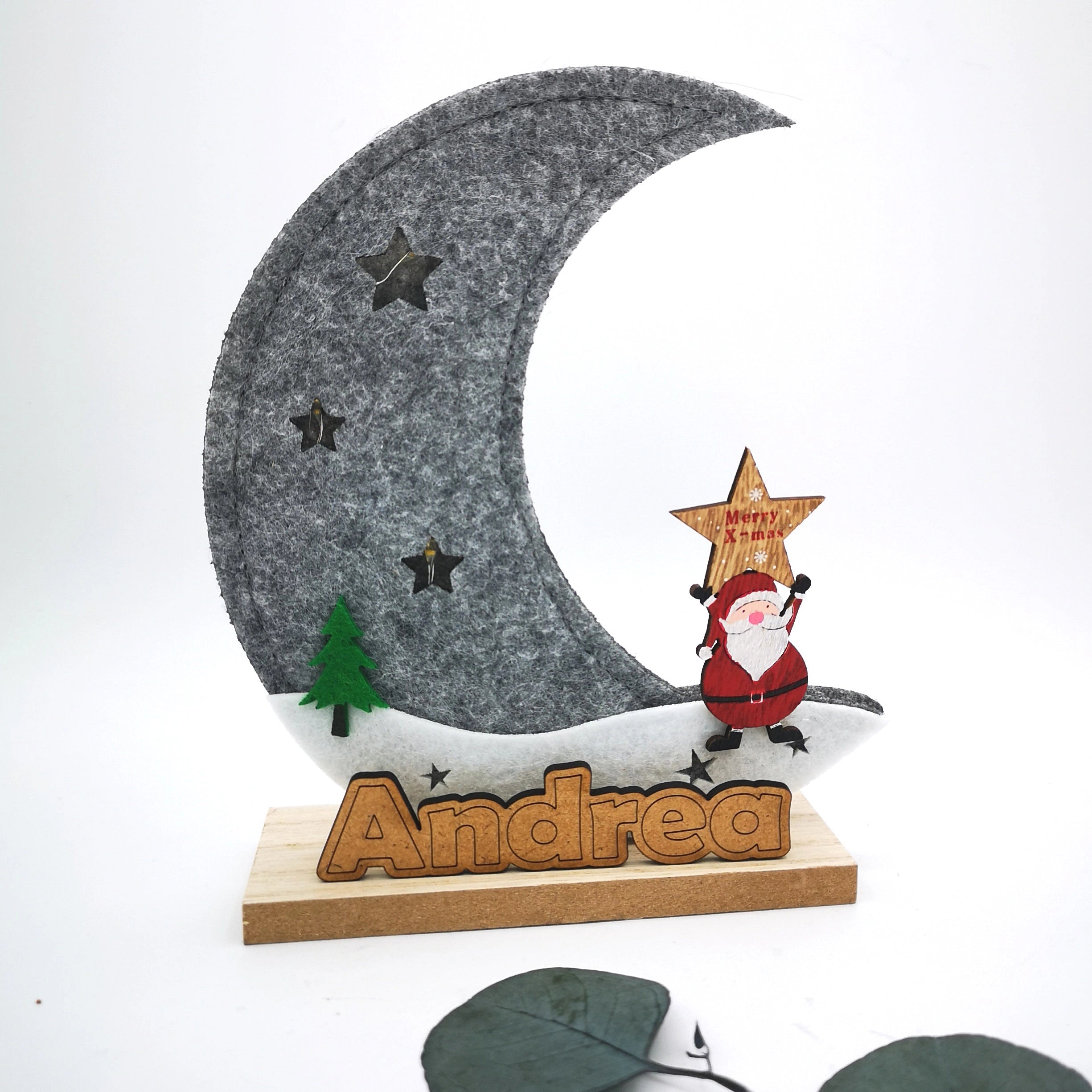 Luna de fieltro de color gris con luces LED y base de madera decorada con un Papa Noel y un abeto.