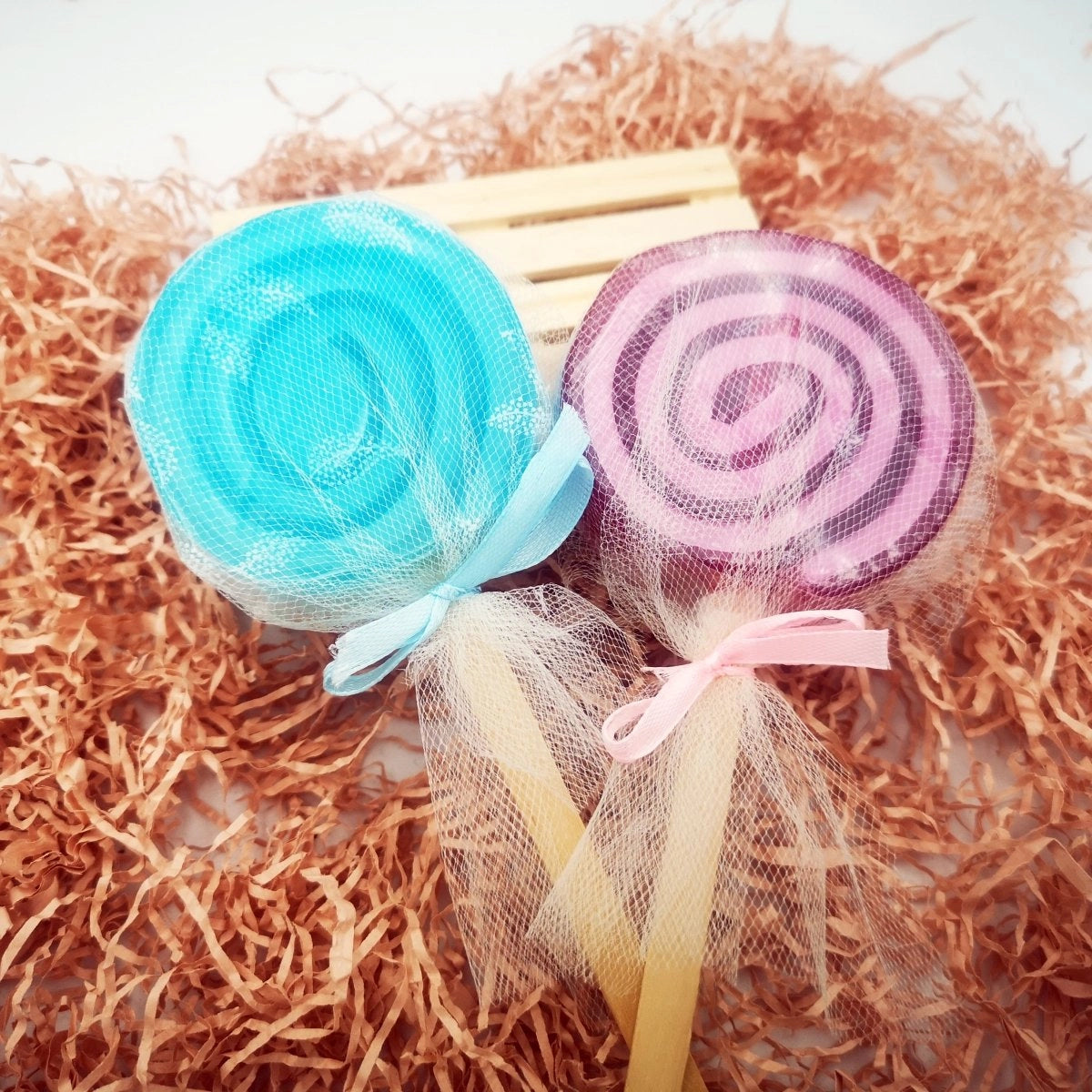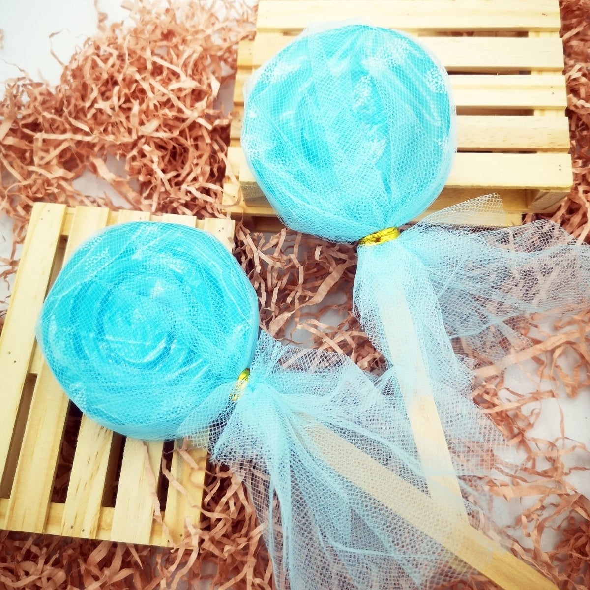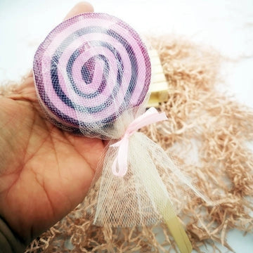 Pastillas de jabón enrollado con diferentes aromas y colores creando bonitas capas, con un aspecto dulce y un aroma intenso . Presentado con palo imitando una piruleta y envuelto en tul para hacerlo ideal para tus celebraciones.
