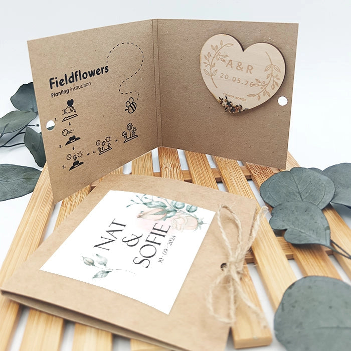 El corazón se presenta en una carpetita de cartón kraft reciclado, con instrucciones de plantado en su interior y una etiqueta exterior de diseño elegante, cerrada con lazo de cuerda natural. Una combinación perfecta de estilo rústico y compromiso con el medio ambiente.