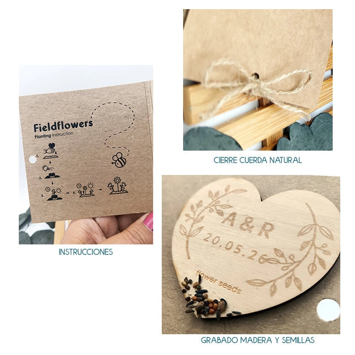 Un detalle lleno de vida y significado. Este corazón de madera grabado con semillas de flores silvestres es un regalo natural, sostenible y original para sorprender a los invitados en cualquier celebración.