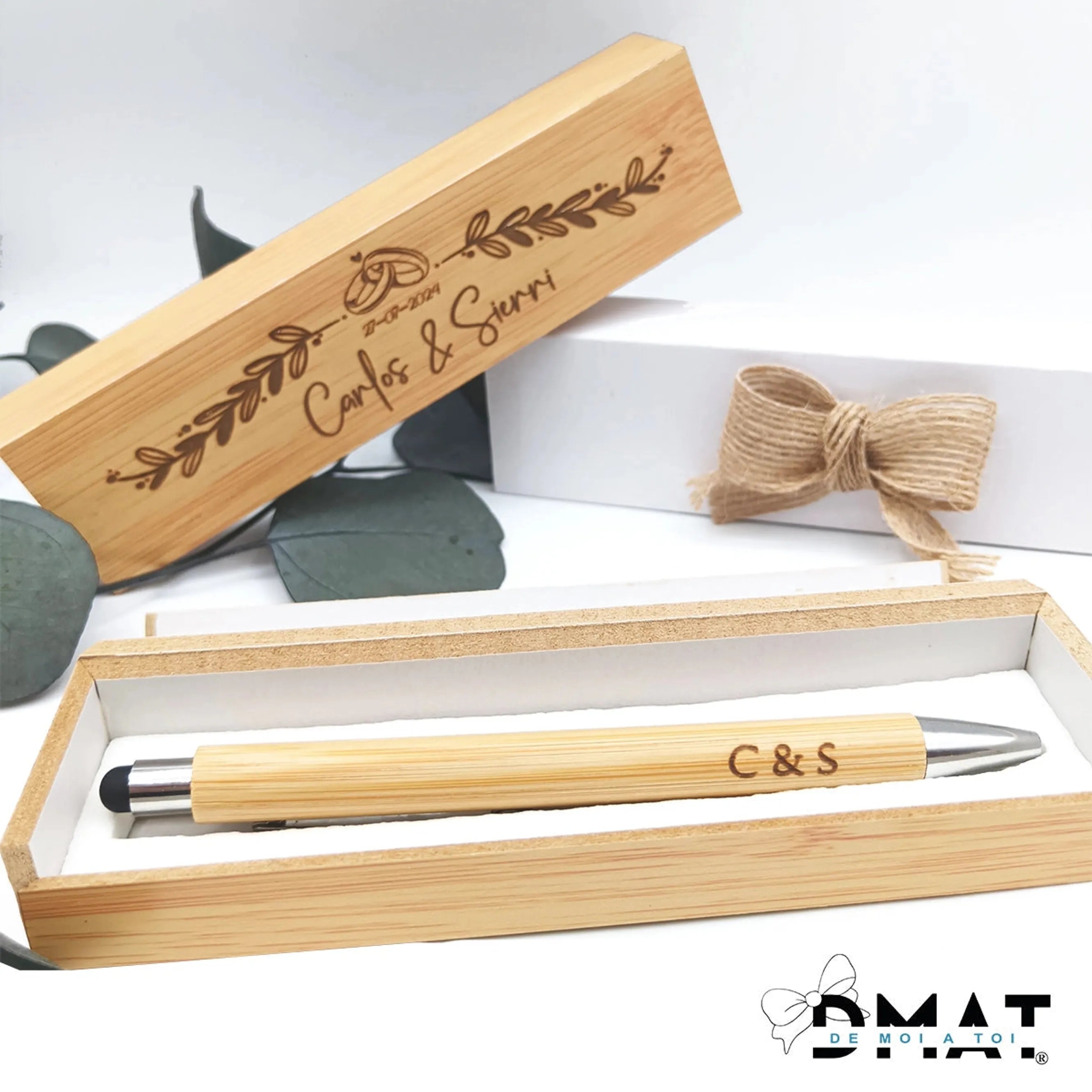 Este bolígrafo de bambú grabado personalizado, viene en un elegante estuche también grabado con nombres y fecha. La mejor opción unisex o para hombres. Original, duradero y presentado con un bonito acabado en una faja blanca decorada con un lazo de yute que le da un toque extra de sofisticación, artesanía y elegancia.