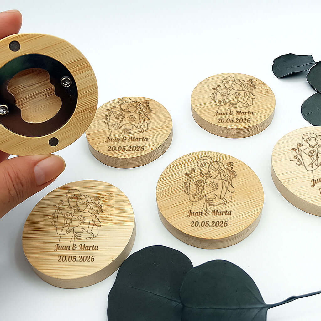 Imán abrebotellas personalizado de bambú: el detalle natural perfecto para tu boda
