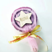 Pastillas de jabón enrollado con diferentes aromas y colores creando bonitas capas, con un aspecto dulce y un aroma intenso . Presentado con palo imitando una piruleta y envuelto en tul para hacerlo ideal para tus celebraciones.