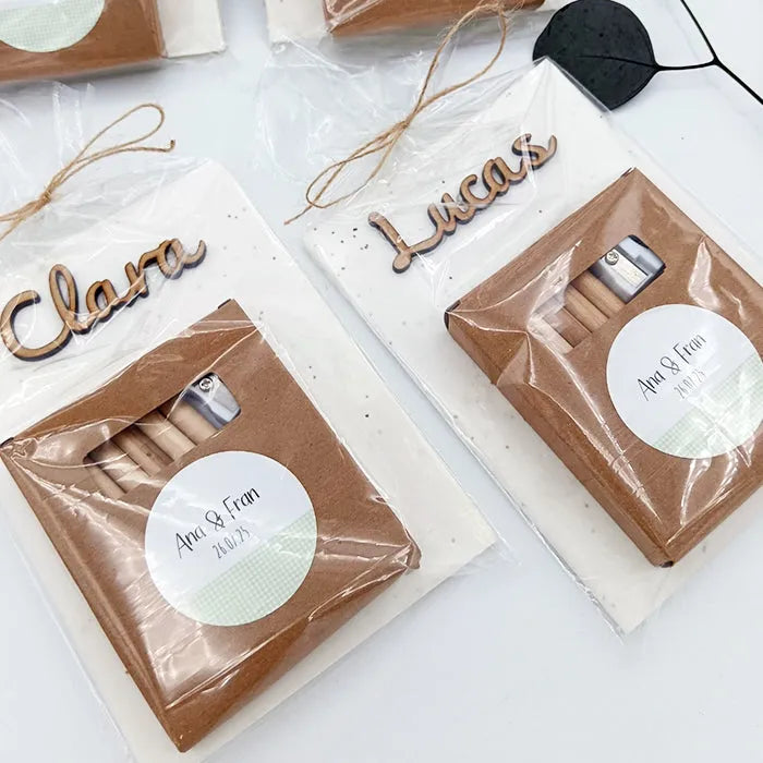 Incluye una libreta degradable de 40 hojas con semillas personalizada con el nombre del nene o nena tallado en madera, set de colorear con colores, sacapuntas y bloc de colorear.