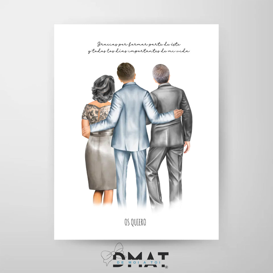 La lámina personalizada de novio y padres es un recuerdo elegante que representa la conexión y el cariño entre padres e hijo en uno de los momentos más importantes de la vida. Diseñada para bodas, aniversarios o celebraciones familiares, esta ilustración premium combina emoción, estética y un acabado de alta calidad.