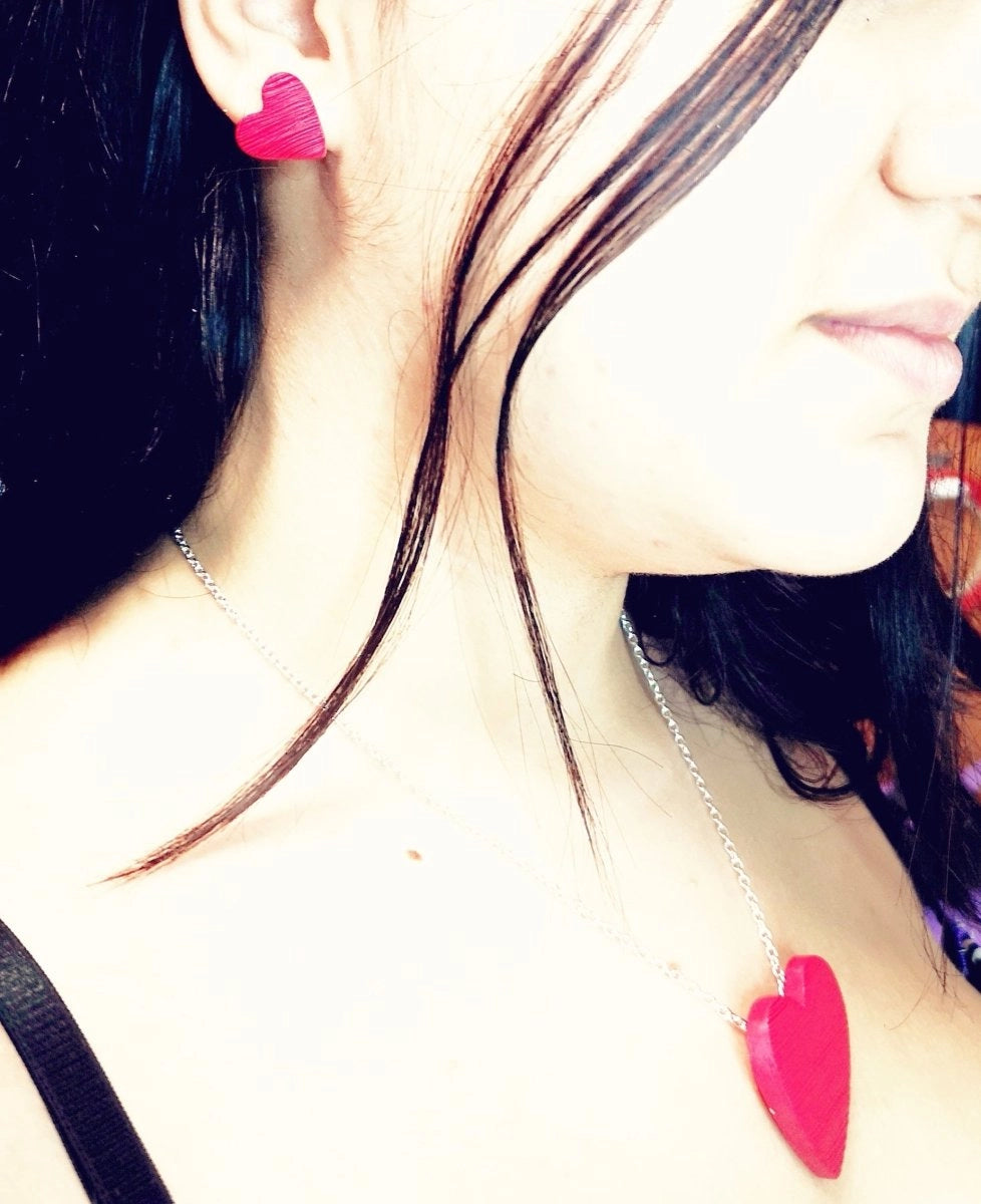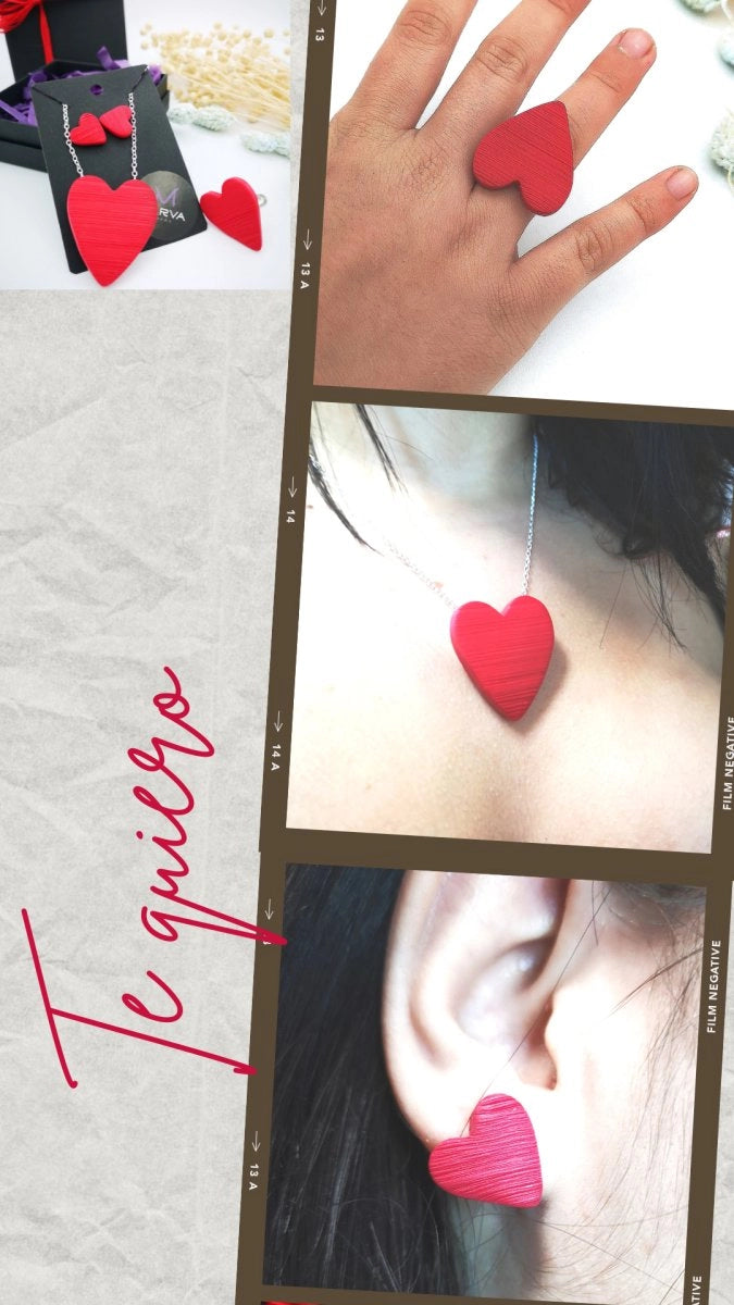 Aquí os traigo un conjunto de colgante y pendientes en forma de corazón en un color rojo vivo simbolizando la pasión y el amor.