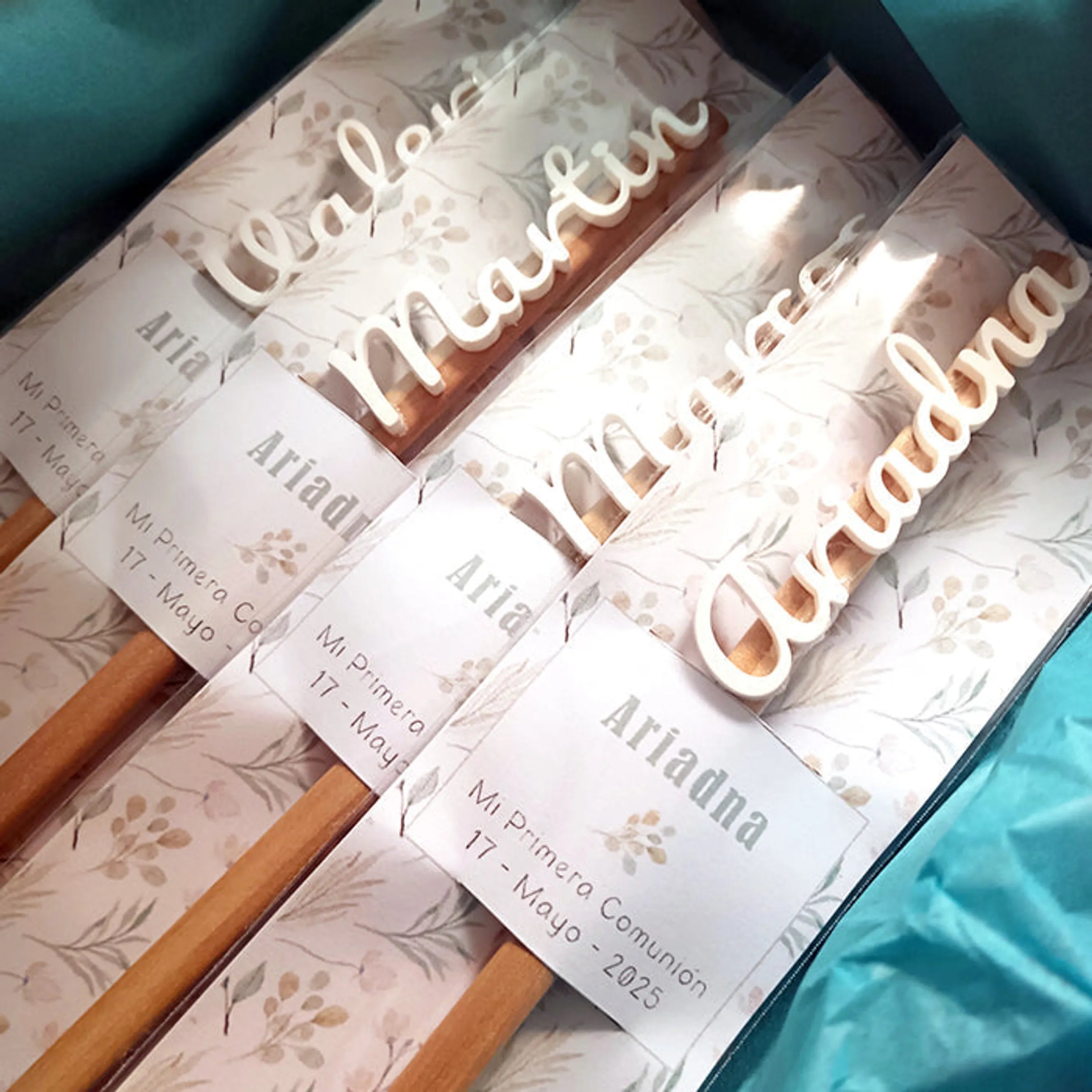 Cada lápiz se presenta embolsado con un elegante cartón personalizado, donde puedes incluir nombre, fecha y tipo de celebración. Ideal como regalo para bodas, bautizos, comuniones o aniversarios, su diseño con motivos naturales le da un toque cálido y especial.