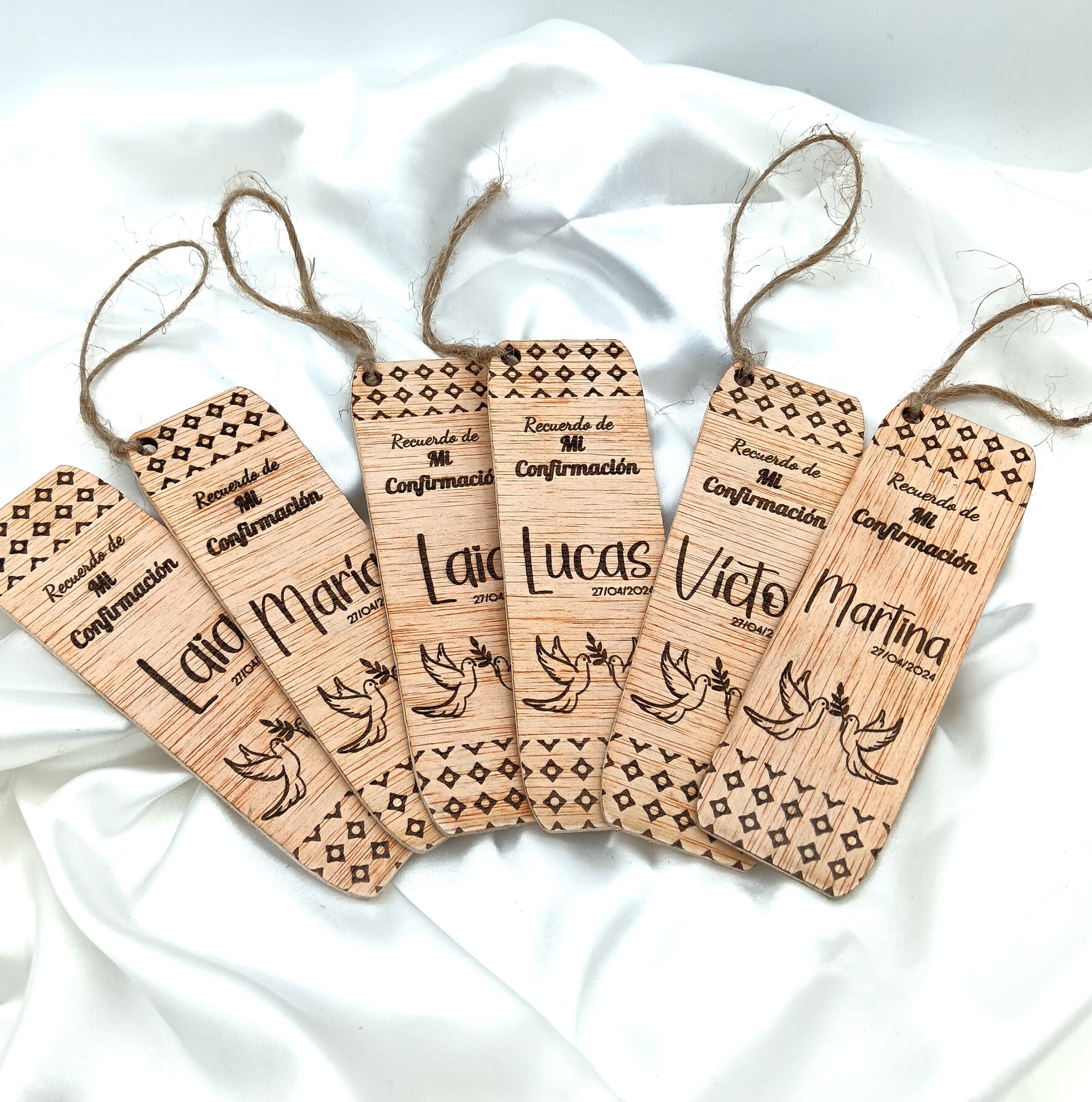 Este marca páginas de madera personalizado con grabado láser es el detalle perfecto para comuniones, bautizos o eventos especiales.