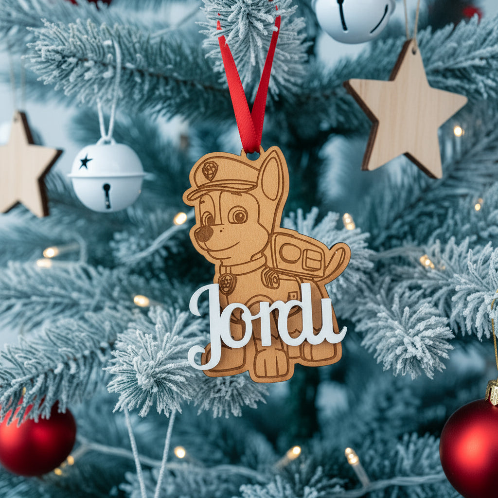 Los más pequeños también merecen tener su lugar en el árbol. Nuestra decoración navideña infantil de la Patrulla Canina está diseñada para hacer brillar su Navidad con un toque personalizado y alegre. Hecha en madera natural, incluye el nombre tallado en relieve y pintado a mano en color azul nieve (blanco), aportando un acabado suave y festivo.