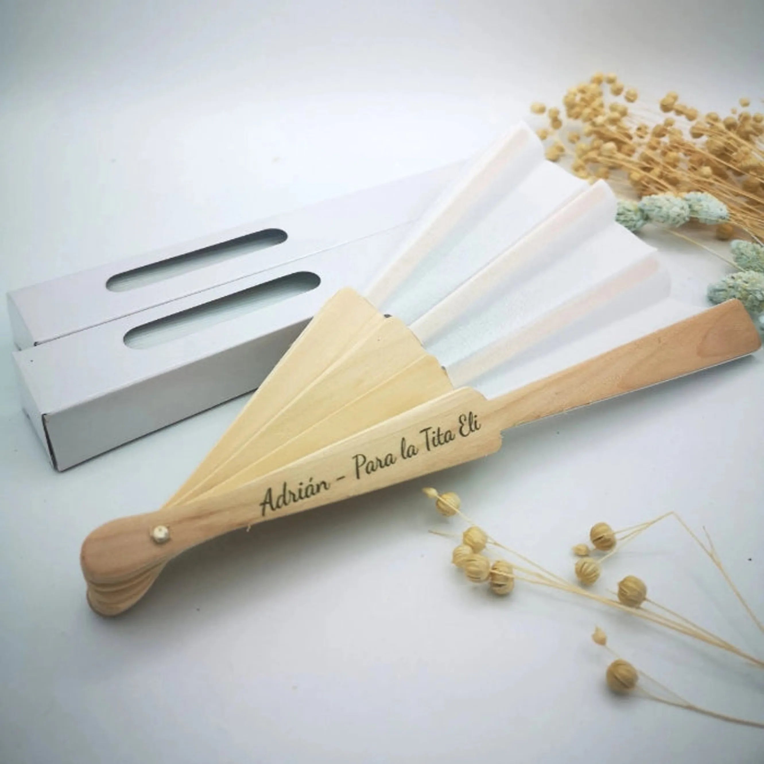 Este abanico de madera personalizado es el detalle perfecto para bodas, comuniones y bautizos. Cada pieza está grabada a láser con el nombre, inicial o fecha que elijas, creando un recuerdo único, duradero y con encanto artesanal. Su acabado natural y su estilo atemporal lo convierten en un regalo práctico y con valor sentimental.