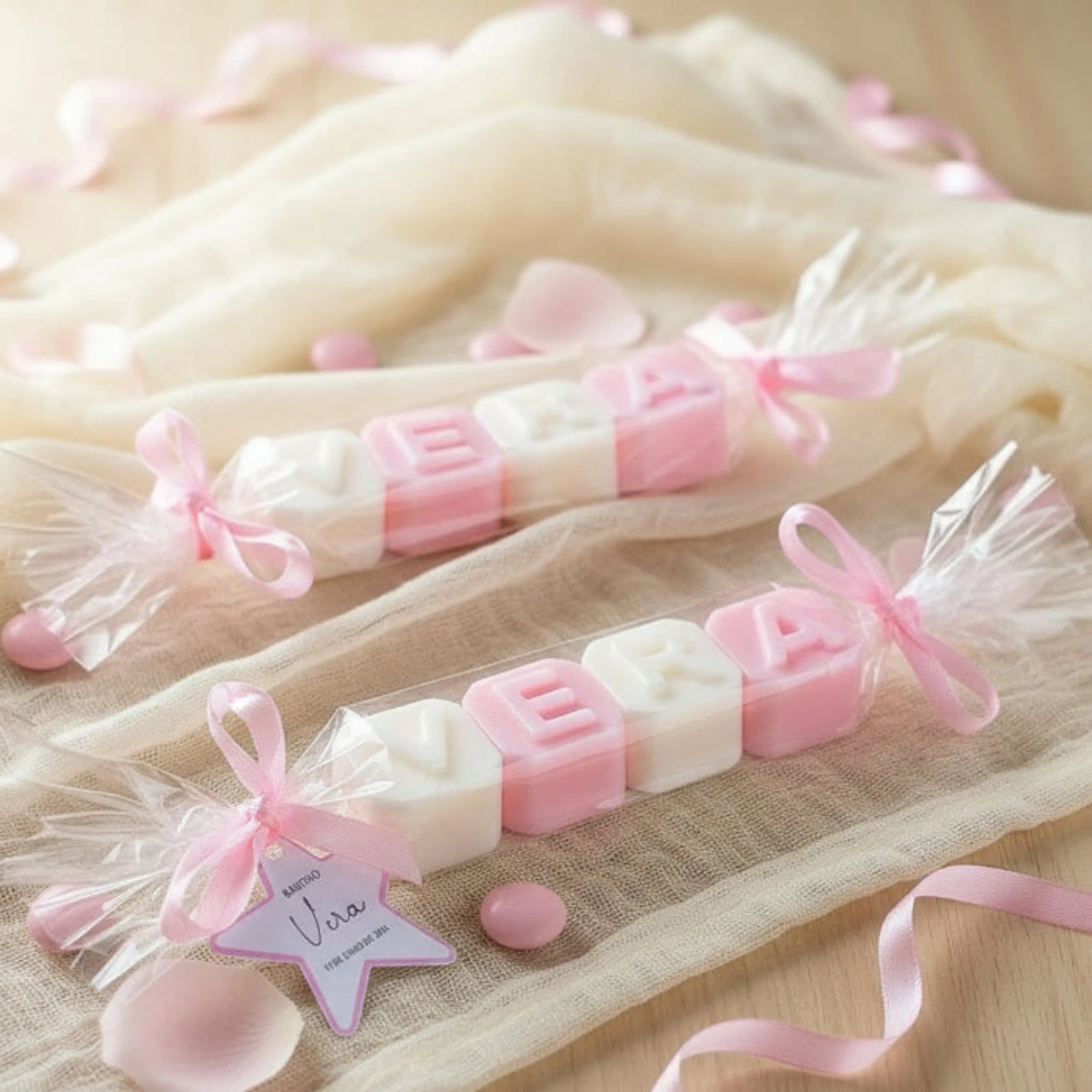 Descubre los nombres de jabón personalizados de De moi à toi, un recuerdo artesanal, natural y lleno de encanto. Cada letra está elaborada a mano con jabón de glicerina cosmética de alta calidad, libre de parabenos y con un agradable aroma infantil que aporta un toque tierno y elegante a tu celebración.