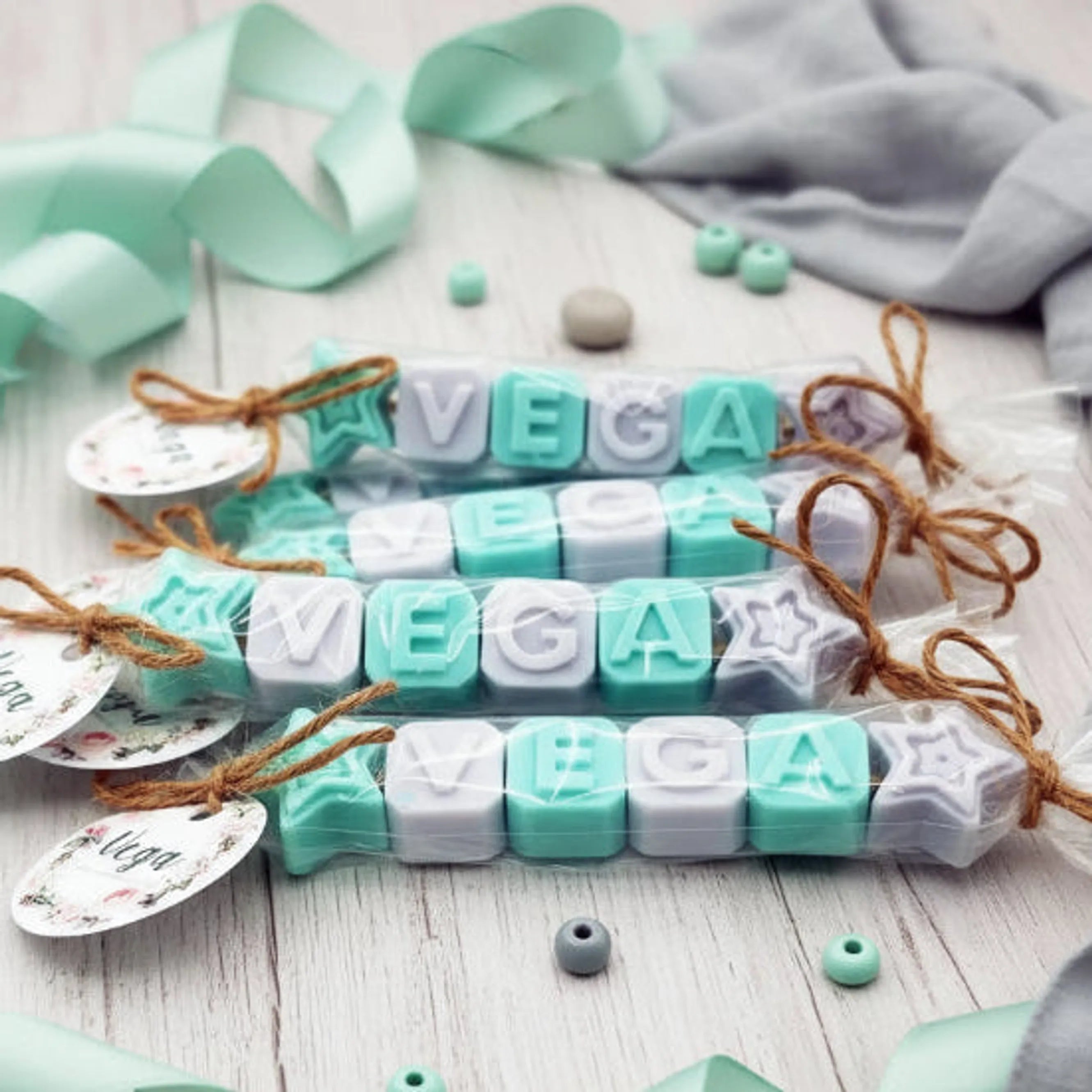 Los nombres están elaborados con jabón de glicerina cosmética de alta calidad, libre de parabenos y con aroma infantil agradable.