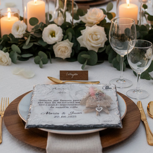 Su acabado en piedra de pizarra natural con bordes irregulares y ramito de flores preservadas aporta un encanto único. Cada pieza se monta y se personaliza de forma artesanal, cuidando cada detalle para que el resultado sea tan especial como quien lo recibe.