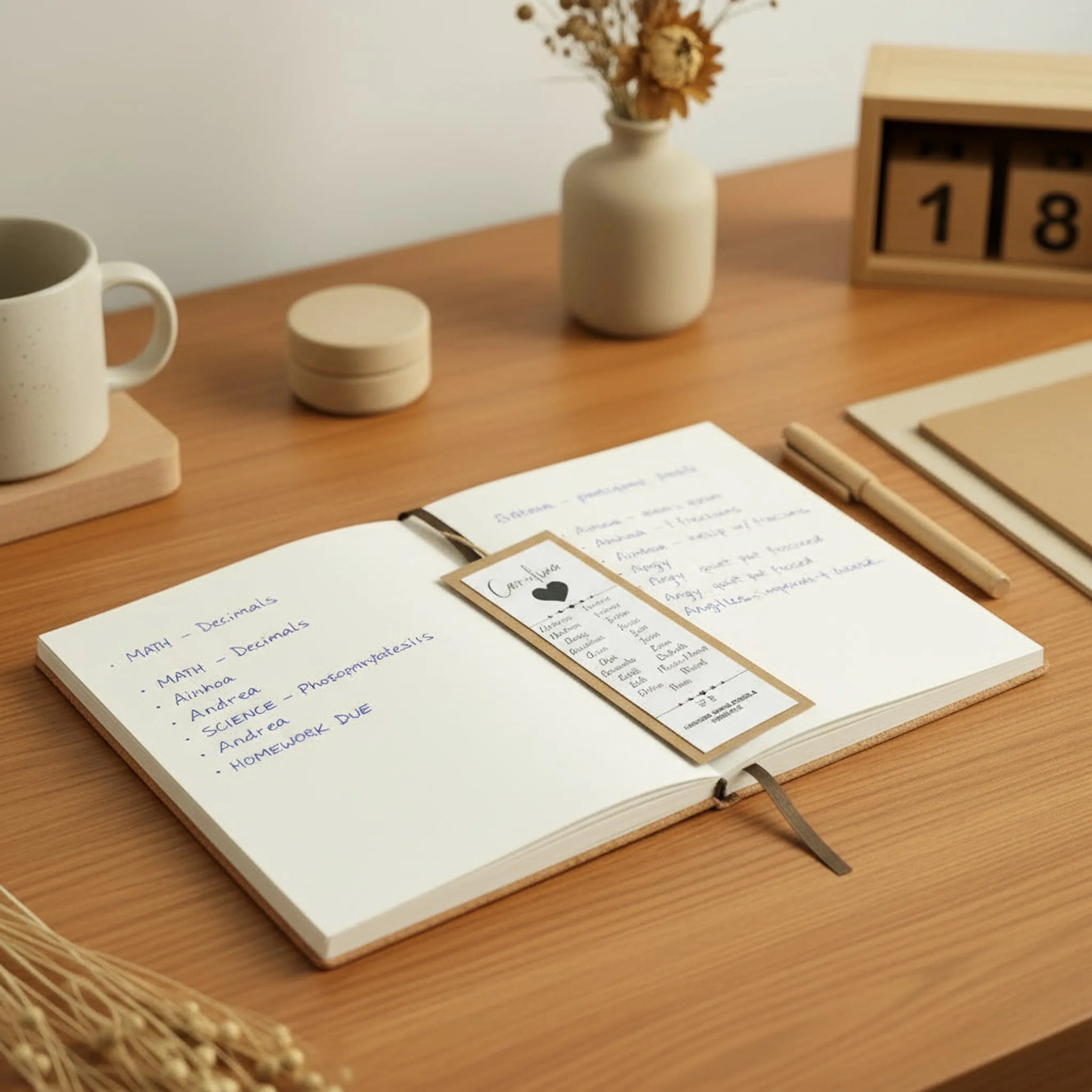El cuaderno cuenta con tapas duras de corcho y algodón, un soporte elástico que sujeta el bolígrafo a juego y un marcapáginas personalizado con los nombres del alumnado o una dedicatoria especial. Además, la portada se puede personalizar con el nombre del destinatario y un texto corto debajo (por ejemplo, “La mejor profe”, “Gracias por todo”, o el nombre del colegio).