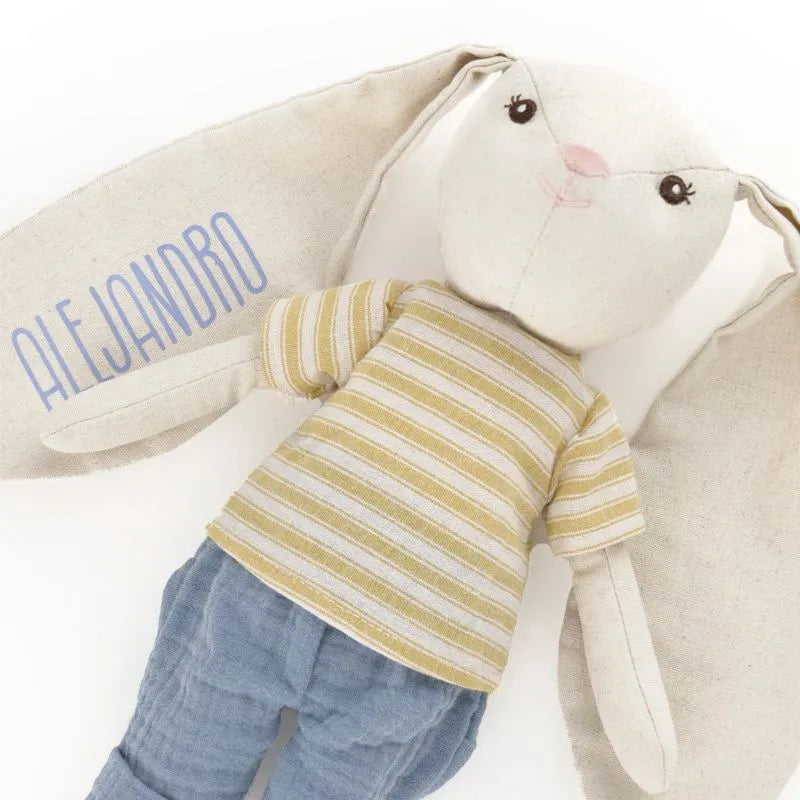 Sorprende con un bonito muñeco de conejito personalizado con el nombre de tu bebé.