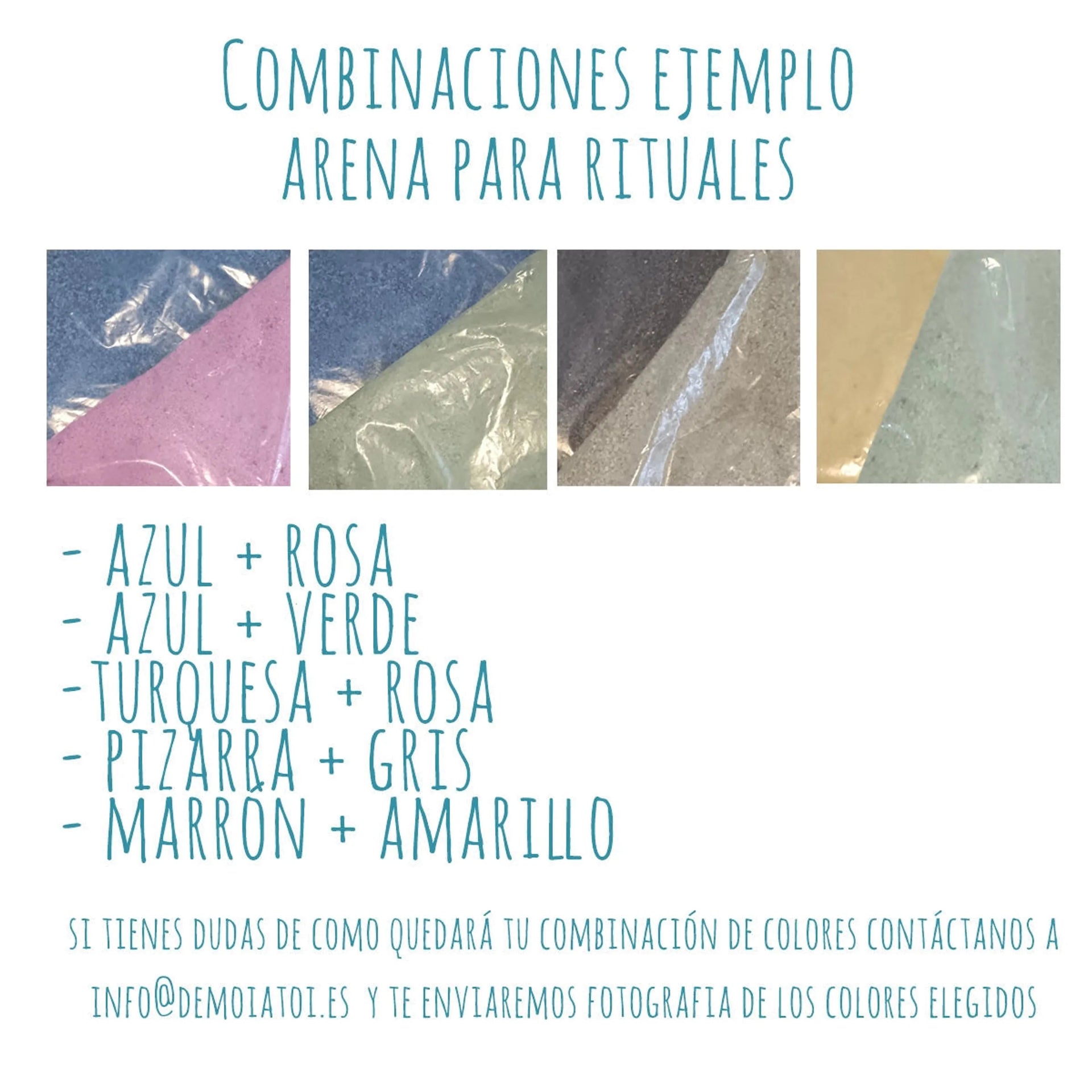 - 2 Frascos de cristal con arena en dos colores diferentes (Se puede elegir en personalización y añadir más tarros ) personalizados con las iniciales de los novios o familiares que realizan el ritual. Se puede personalizar con las iniciales en los frascos o con un colgante de madera con la inicial grabada.
