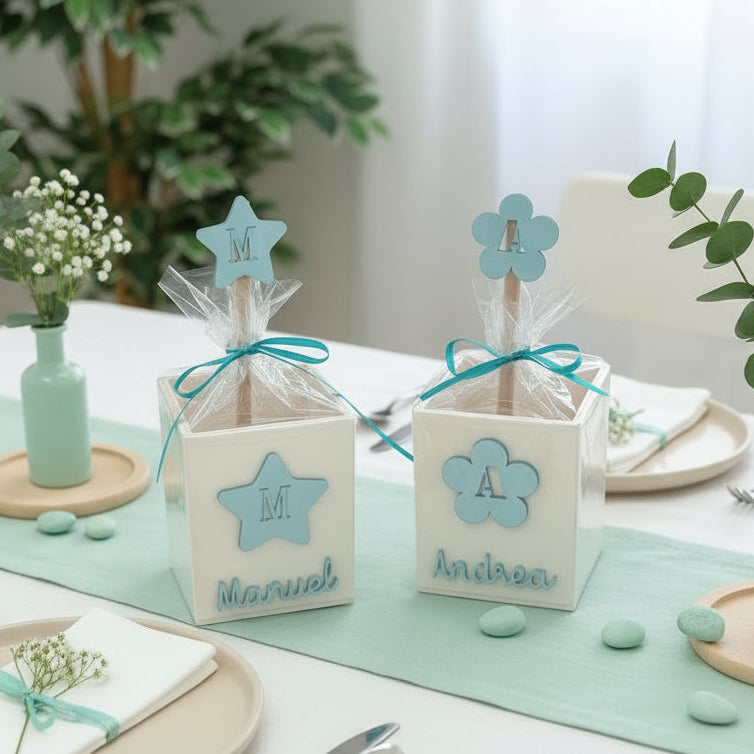 Su base de madera natural y el nombre en relieve crean una combinación cálida y luminosa. Puedes elegir entre dos diseños decorativos: Flor o Estrella. Perfecto para regalar en fin de curso, comuniones, cumpleaños o como recuerdo de un día especial.