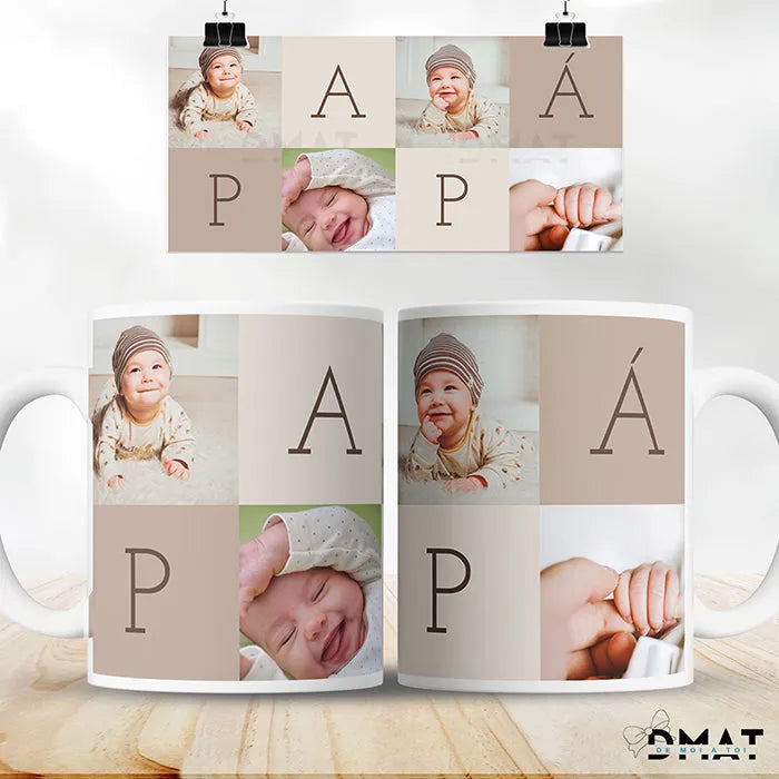 Sorprende a mamá con un regalo único y emotivo. Nuestra taza personalizada con collage de 4 fotos incluye la palabra "PAPÁ", creando un diseño especial lleno de recuerdos y amor.