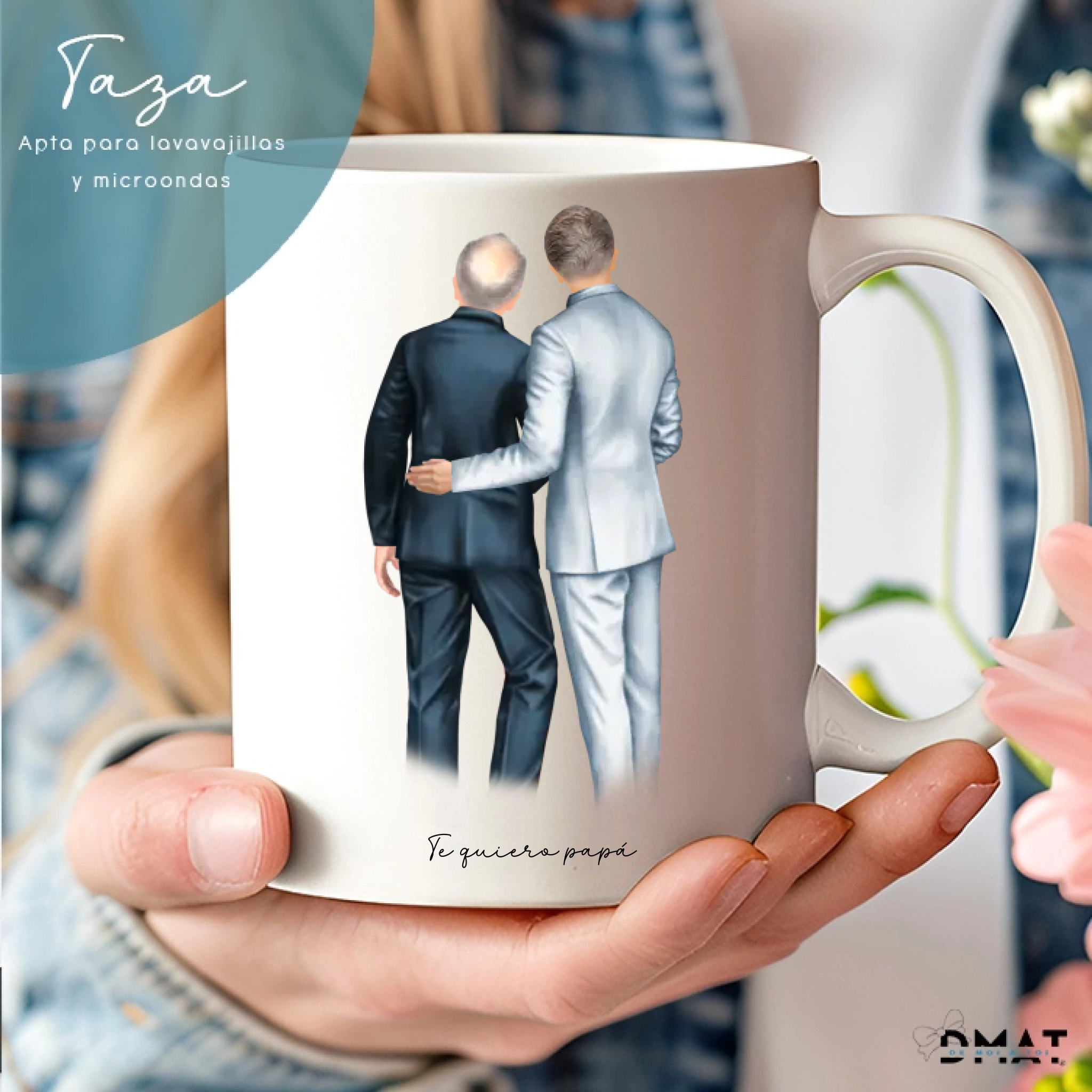 Transforma un momento único en un recuerdo eterno con esta taza personalizada del novio y su padre. Una ilustración que representa el cariño, la complicidad y la admiración entre ambos. Personaliza el color del traje, el peinado y añade una dedicatoria en la parte trasera para crear un regalo de boda original y emotivo que conservará para siempre.