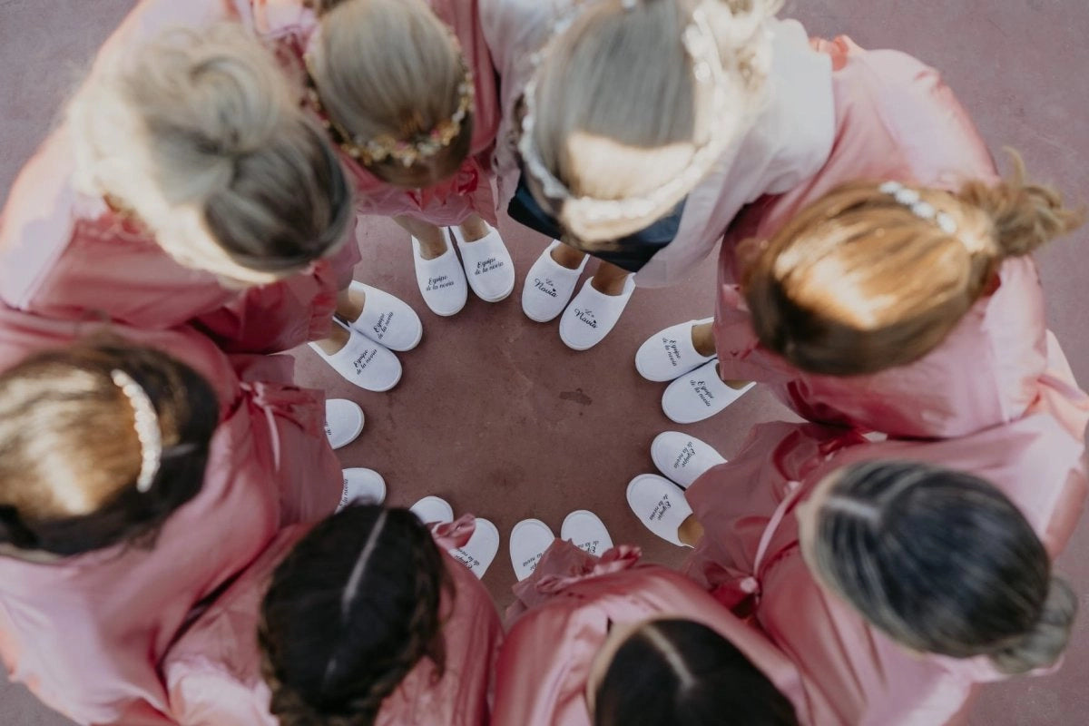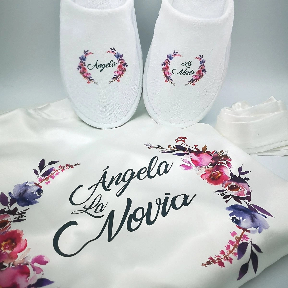 Pack de regalo para novia y equipo de la novia compuesto de bata de satén y zapatillas personalizadas.