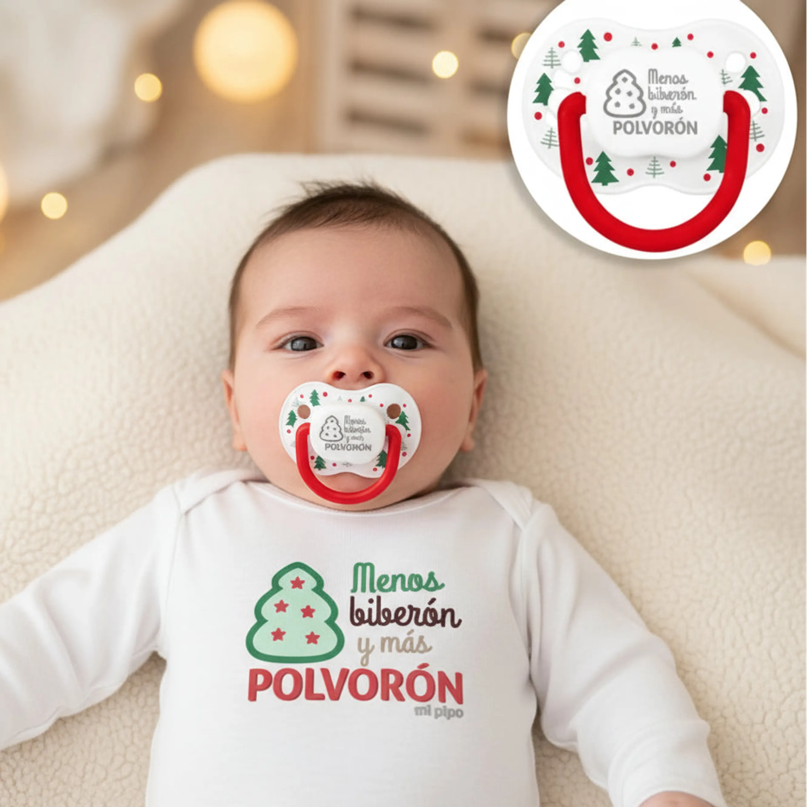 El body está confeccionado en algodón suave, ideal para la piel del bebé, con una frase divertida de Navidad que puedes elegir según el idioma. El chupete Baby completa el conjunto con un diseño alegre en color rojo navideño. Todo está pensado para crear un recuerdo bonito, práctico y lleno de ilusión.