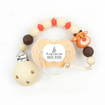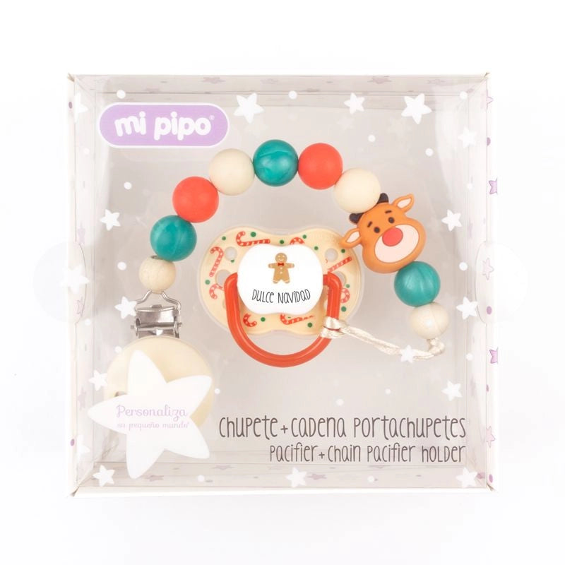 Incluye chupete y cadena porta chupetes con divertido diseño de navidad.