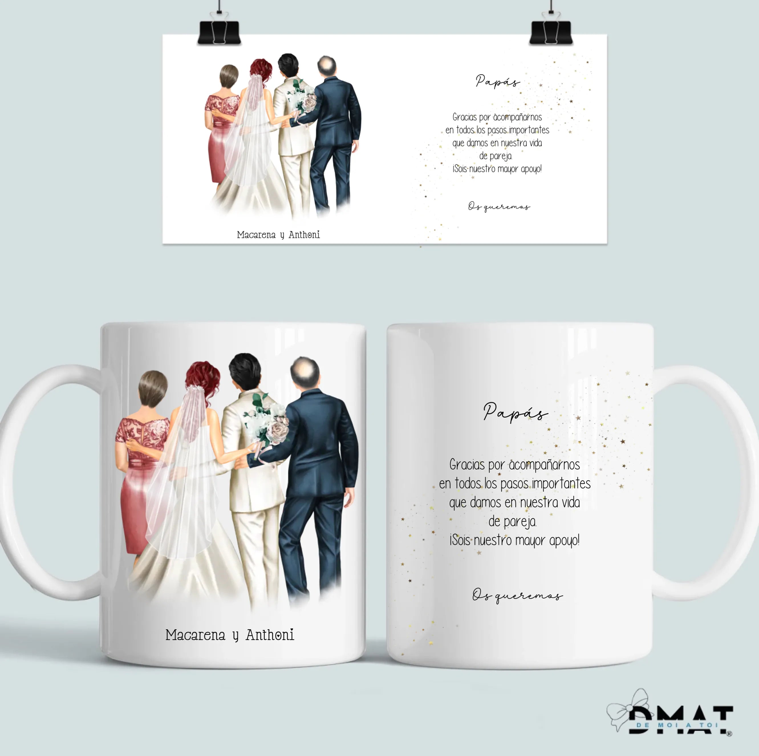 Esta taza personalizada de boda es el regalo perfecto para agradecer a los padres del novio o de la novia su amor incondicional, apoyo y presencia en uno de los días más importantes de la vida. Personaliza la ilustración eligiendo ropa, fondo, peinados y nombres, o añade una dedicatoria única en la parte trasera. Un recuerdo elegante, sentimental y duradero que emocionará a quienes más quieres.