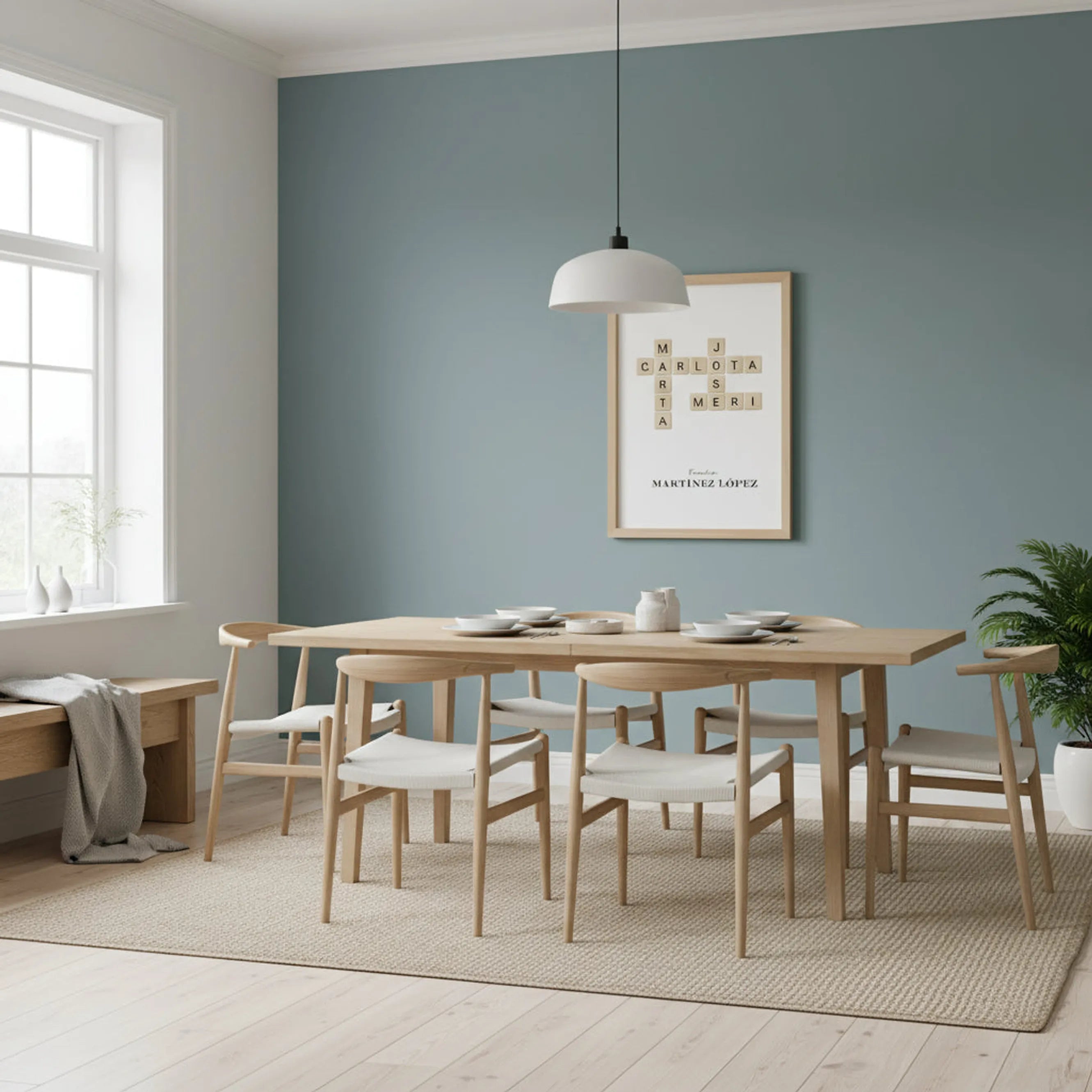 Perfecta como regalo para familias, compañeros de trabajo o amigos, esta lámina combina estética y emoción. Puedes incluir el apellido familiar, una dedicatoria corta o una firma, haciendo de cada pieza un recuerdo especial. Su estilo limpio y tipografía inspirada en las piezas clásicas de Scrabble aportan un toque moderno y decorativo.