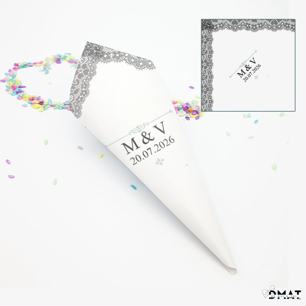 Personaliza cada cono con vuestros nombres, iniciales o fecha y añade un toque de distinción a la salida de los novios. Puedes elegir recibirlos montados y listos para rellenar con arroz, pétalos o confetti, o bien sin montar, con cinta adhesiva incluida para su montaje. Su diseño monocromático combina a la perfección con decoraciones en blanco y negro, dorado o plata, creando un efecto visual impactante y sofisticado.