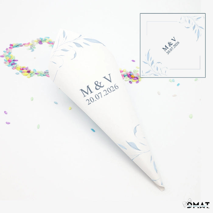 Personaliza cada cono con vuestros nombres, iniciales o fecha y añade un toque de estilo a vuestra ceremonia. Puedes elegir recibirlos montados y listos para rellenar con arroz, pétalos o confetti, o bien sin montar, con cinta adhesiva incluida para un montaje rápido y sencillo. Su diseño azul combina perfectamente con decoraciones de boda clásicas, elegantes o en tonos navy y blanco.