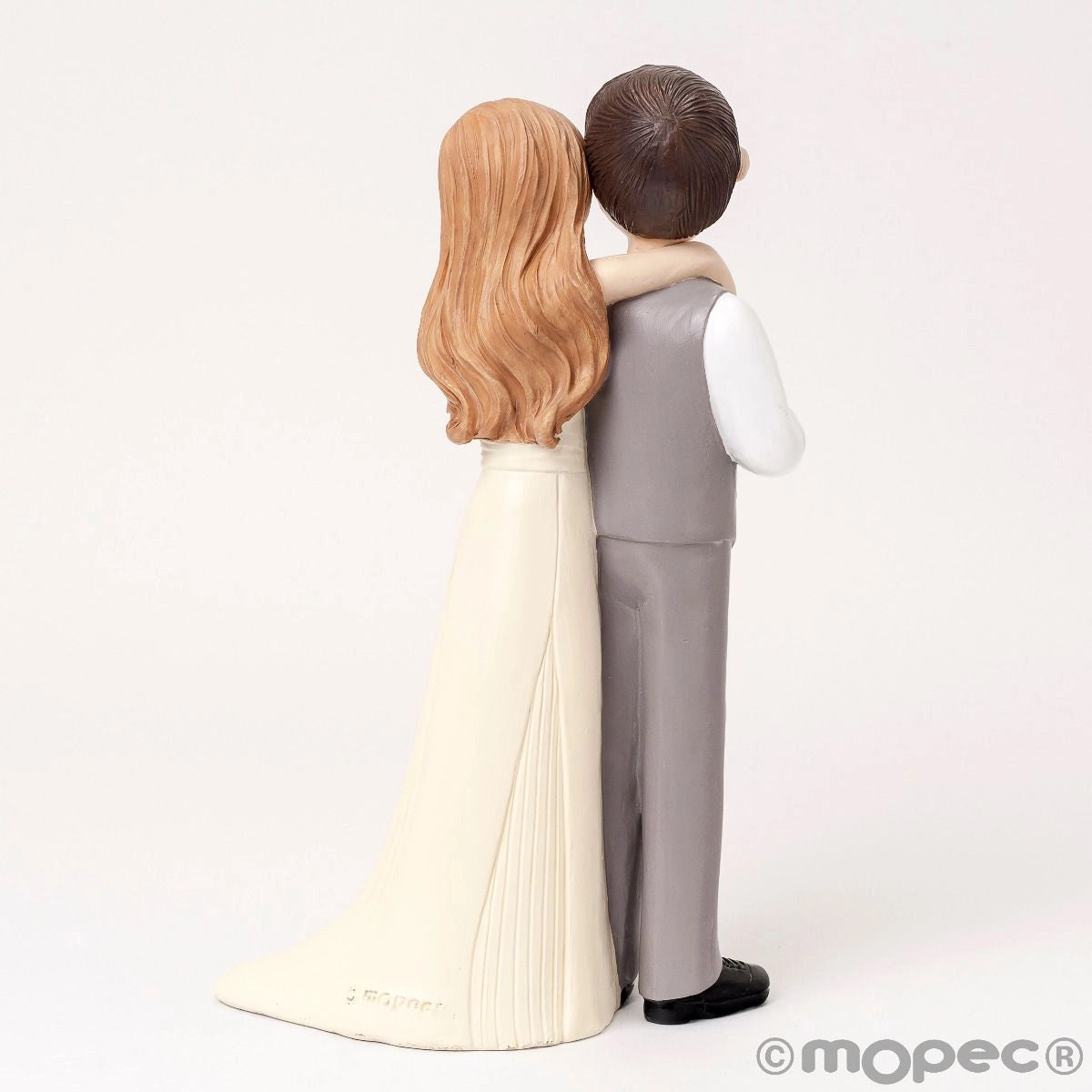 Bonita e informal figura de pastel de 21 cm en la que la novia abraza cariñosamente al novio.