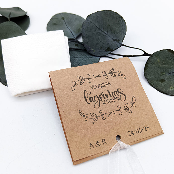 Las lágrimas de felicidad y pañuelos de boda personalizados con diseño kraft natural son el detalle ideal para bodas que apuestan por la sencillez, la sostenibilidad y la belleza de lo auténtico. Su acabado sobrio y elegante encaja en bodas rústicas, ecológicas o minimalistas, aportando calidez sin perder estilo.