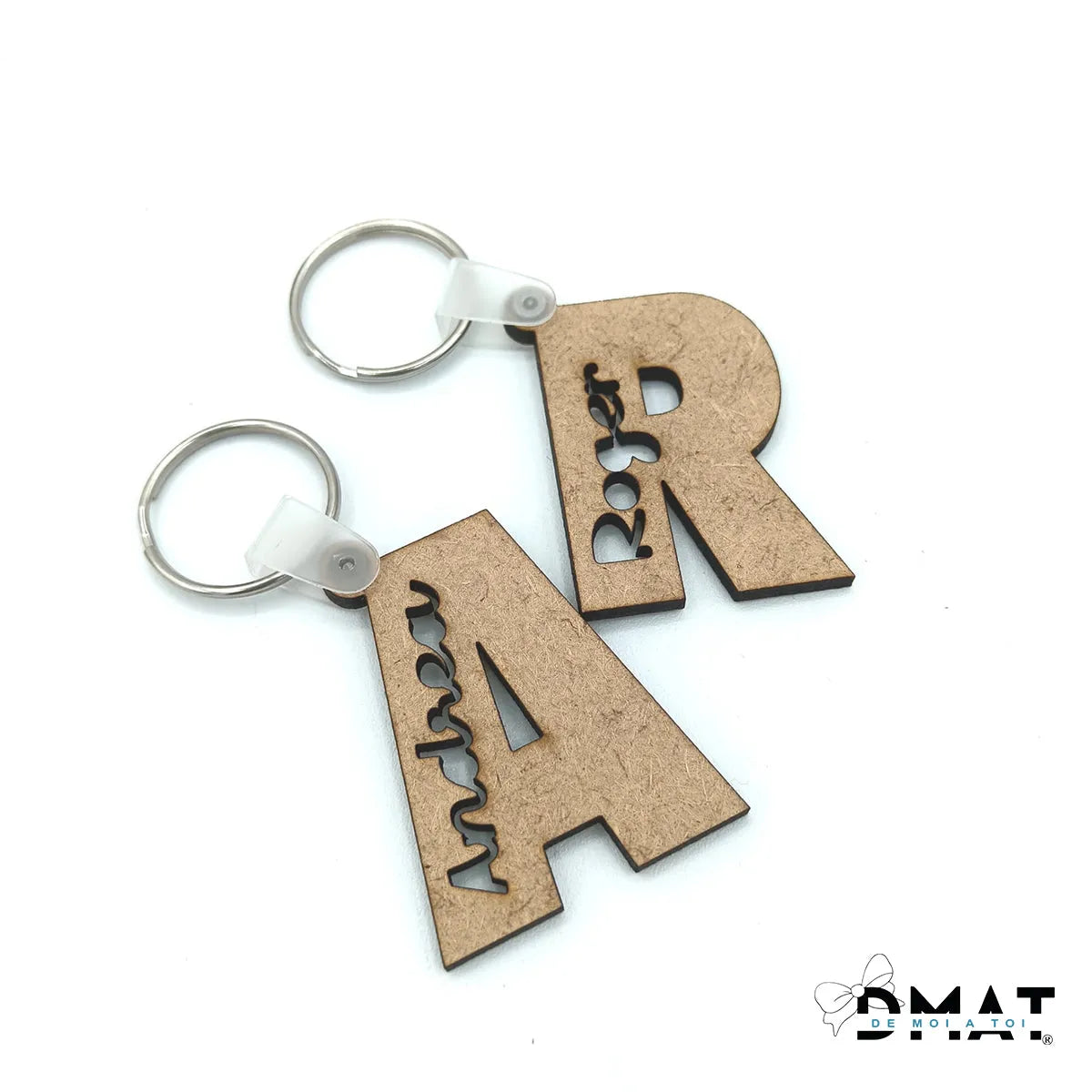 Llavero de madera MDF en color natural con inicial tallada y nombre personalizado. Incluye anilla de metal resistente y enganche de plástico. Medidas aproximadas: 4 cm de alto x 3 cm de ancho (puede variar según la letra).