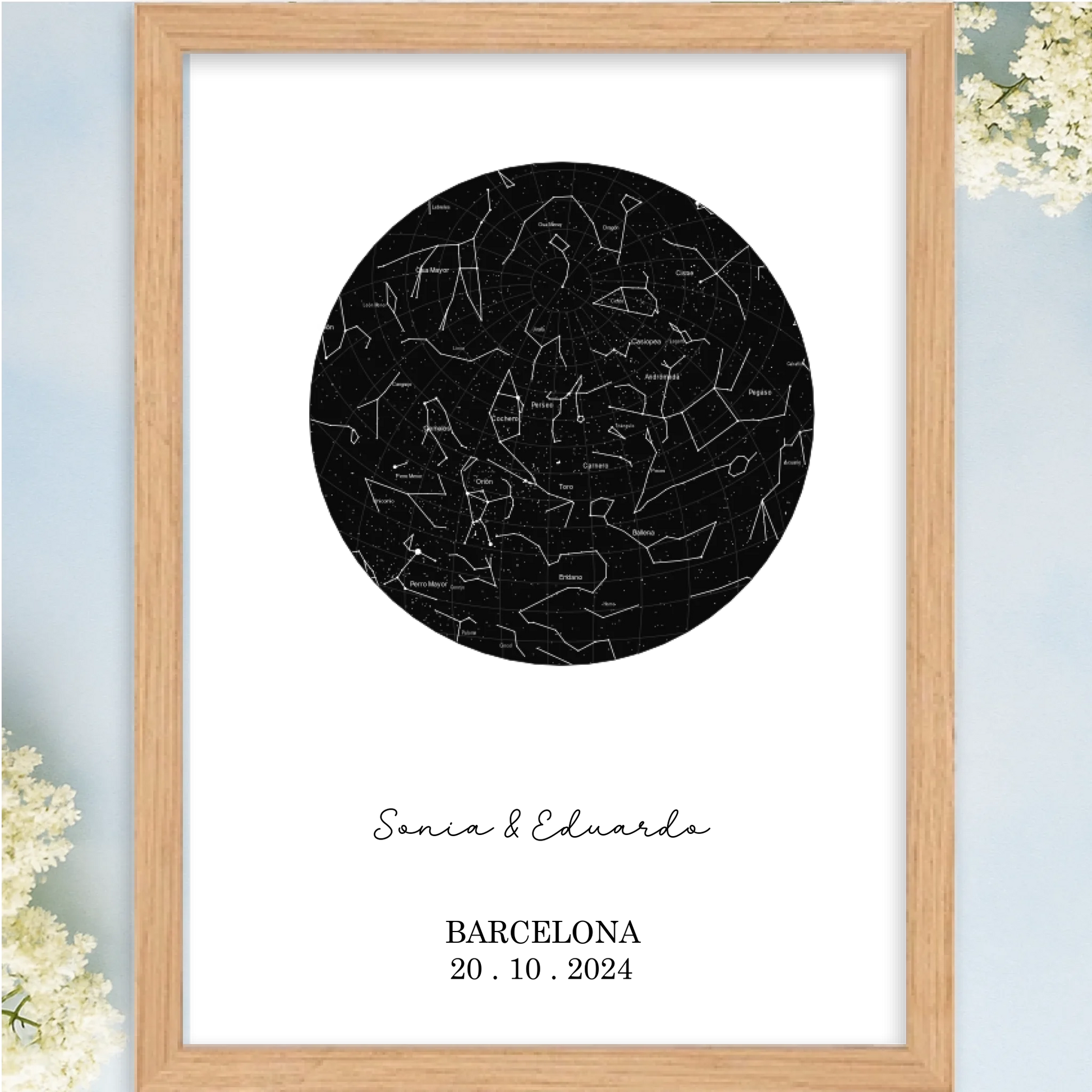 Haz tu pedido ahora y sorprende con un regalo original y romántico que inmortaliza vuestro cielo de estrellas y constelaciones. Láminas y cuadros personalizados con mapa estelar: el detalle perfecto para enamorados, nacimientos y fechas especiales que merecen brillar para siempre en vuestro hogar.